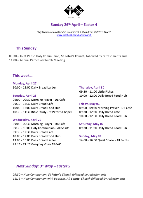 All requests for additions to the newsletter should be sent via e-mail to the parish office: office@huttonparish.com